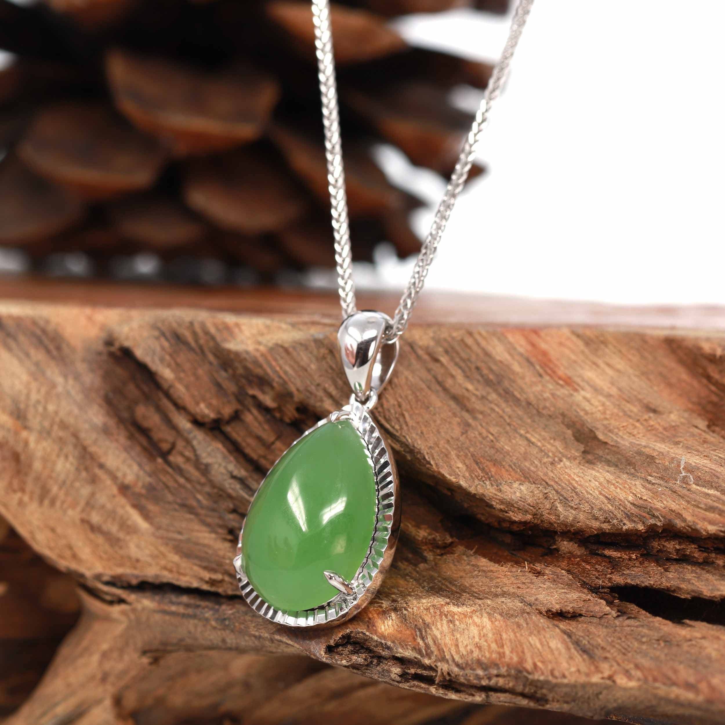 14K Gold "Classic Tear Drop" Green Apple Green Jade Diamond Cut Setting Pendant Necklace