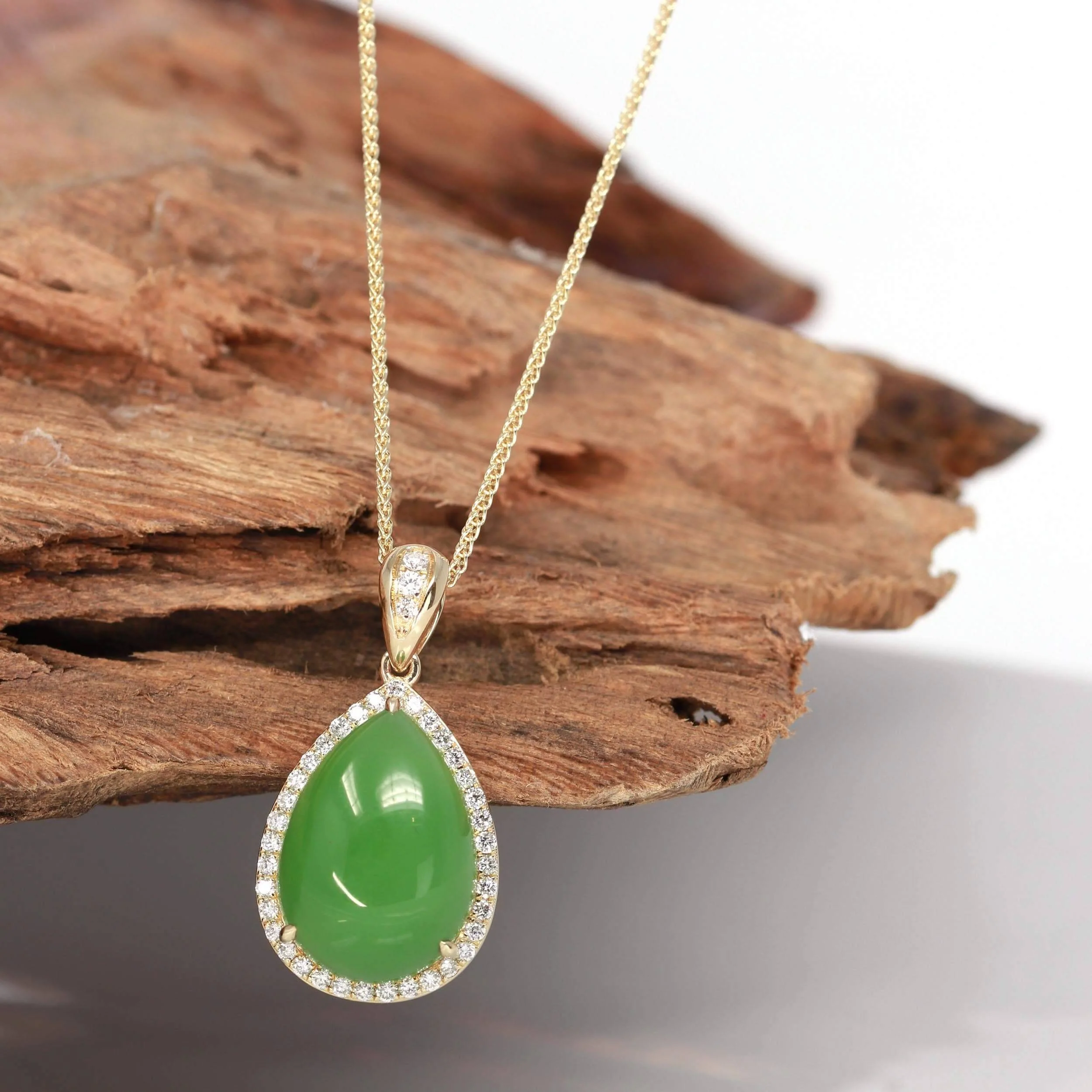 14K Gold Genuine Green Apple Green Jade Tear Drop Pendant Necklace With VS1 Diamond