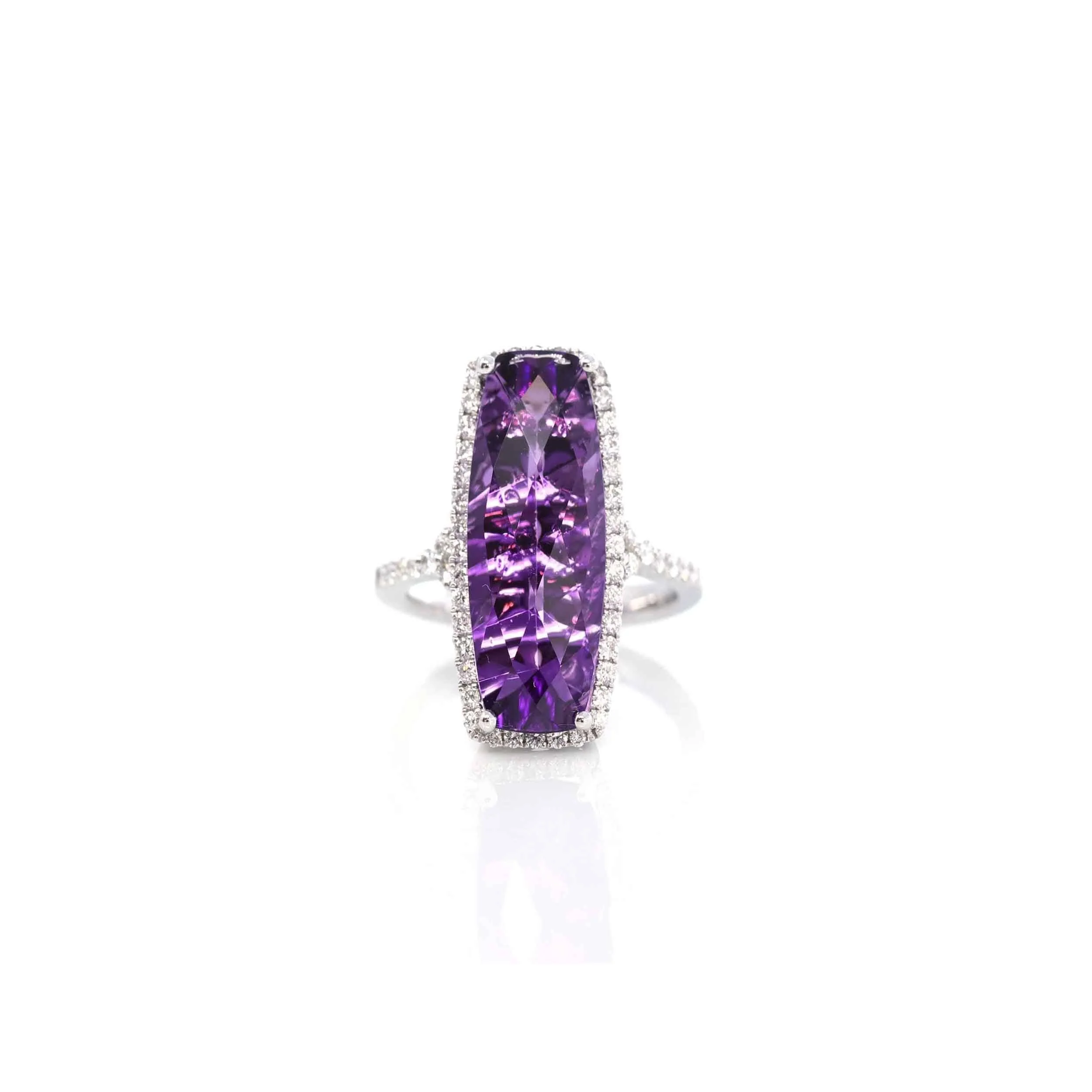 * Design Concept--- This ring features a Cushion Cut Brazillian Amethyst,6.099 ct genuine deep purple amethyst. The design is simplistic yet elegant. The ring looks very exquisite with some diamonds tracing the accents. Baikalla artisans are dedicated to combining beautiful gemstones with modern-day luxury. The essence of this 6.099 ct beautifully faceted amethyst is unleashed by the simplistic setting design that keeps the originality of the rare gem.