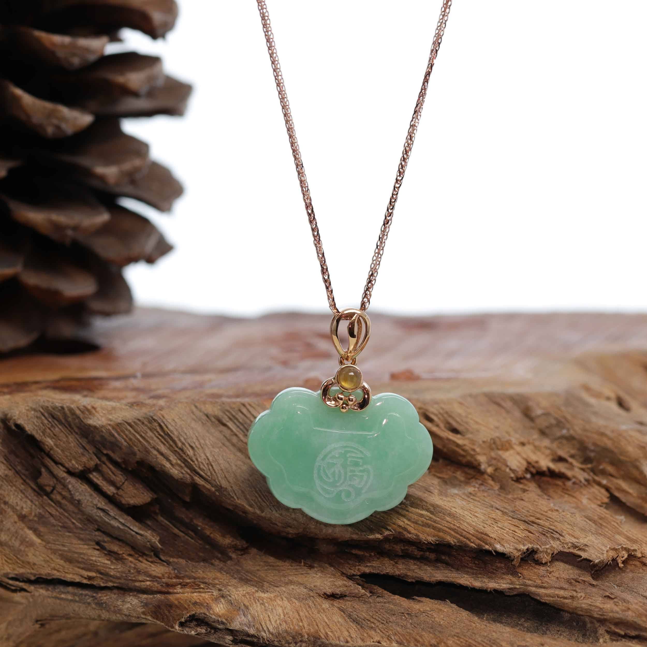 18k Rose Gold Genuine Burmese Green Jadeite Happiness ( Fu & Pingan ) Pendant Necklace