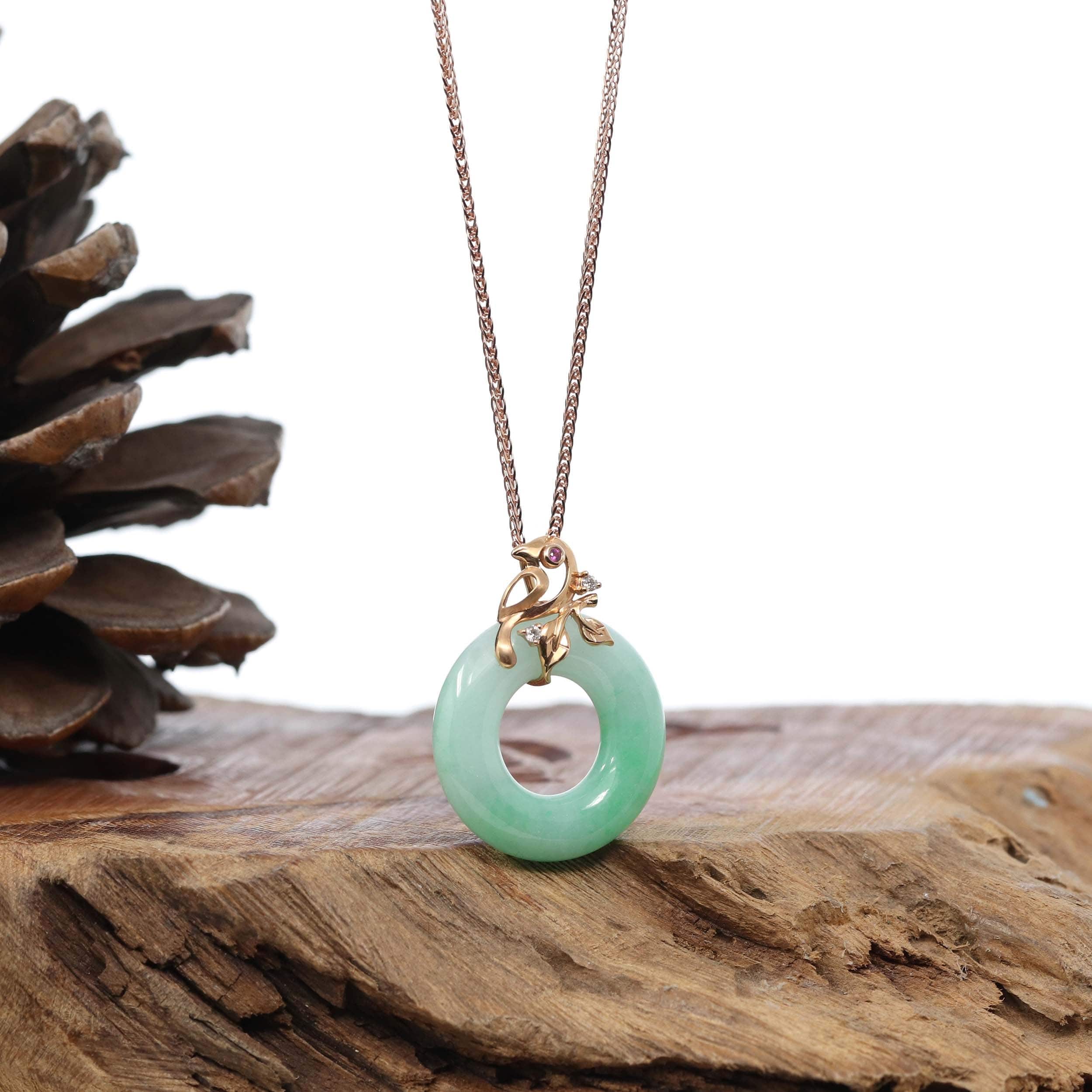 * DESIGN CONCEPT--- 18k Rose Gold & Genuine Burmese Jadeite Pendant Necklace, featuring AA Ruby and Diamond accents. Crafted from high-quality genuine jadeite, this pendant boasts a flawless surface and mesmerizing translucent green colors. The design showcases a symbol of good fortune—a bird standing on the auspicious "Circle of Heaven," symbolizing prosperity, luck, and safety. It's the perfect gift for yourself or someone special.