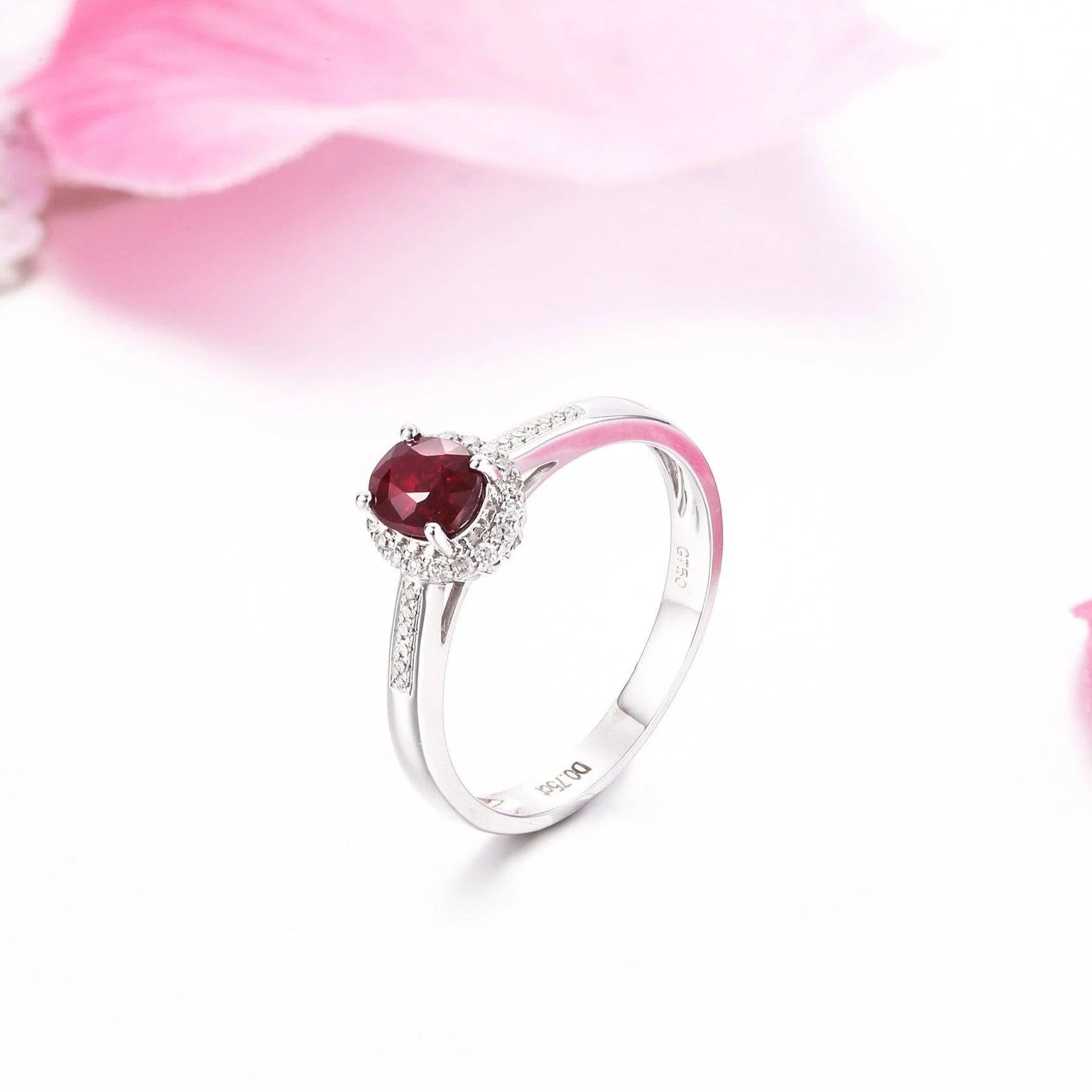 * Design Concept--- This ring features an oval genuine Sri Lanka 0.75ct genuine Ruby. The design is simplistic yet elegant. The ruby is set in a secure 4 prong setting, with a simple yet classic halo design with diamonds down the sideband. Baikalla artisans are dedicated to combining beautiful gemstones with modern-day luxury. The essence of this 0.75ct ruby is unleashed by the strikingly brilliant diamonds and the simplistic setting design that keeps the originality of the rare gem.