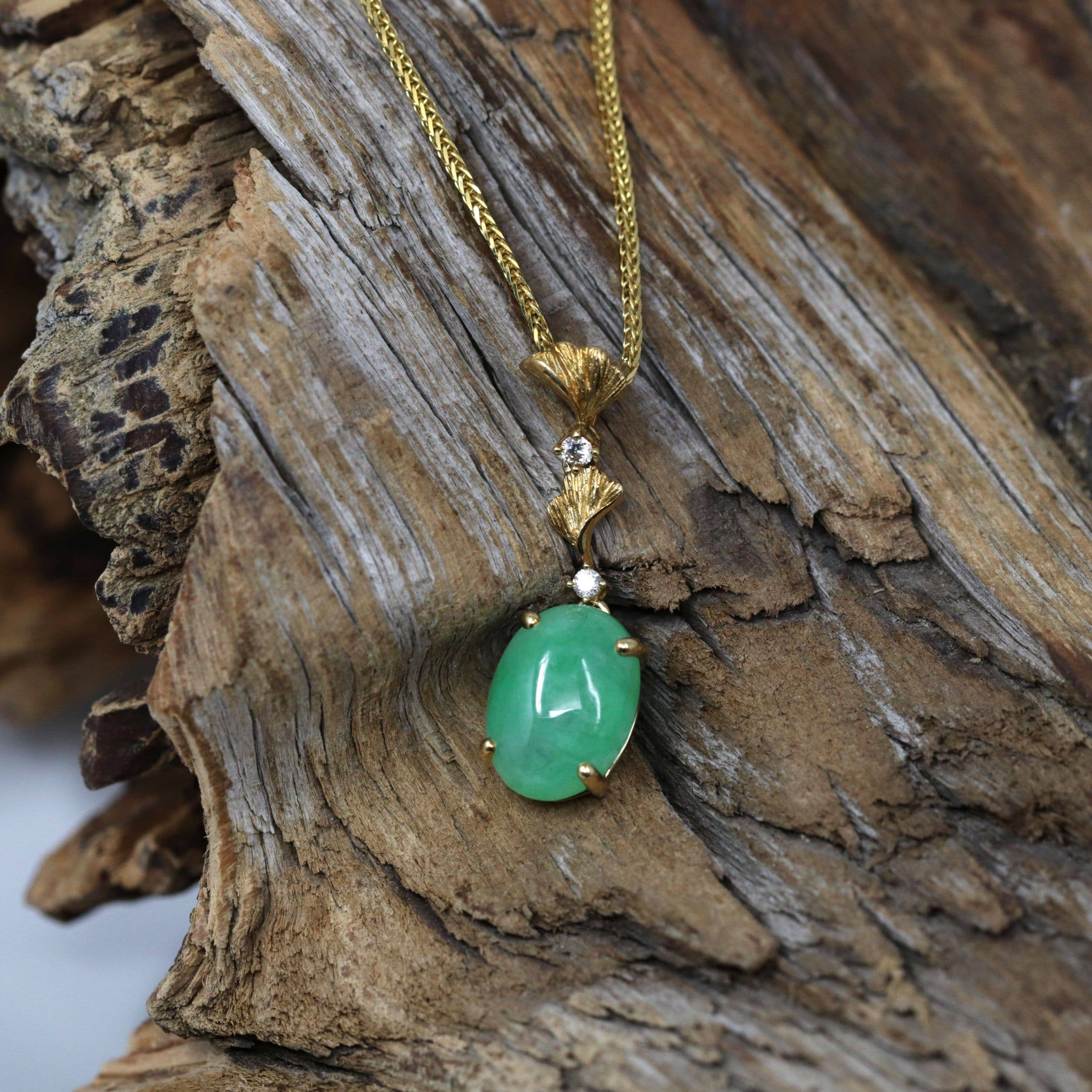 18k Yellow Gold Jadeite Jade Ginkgo Leaf Pendant Necklace with Diamond