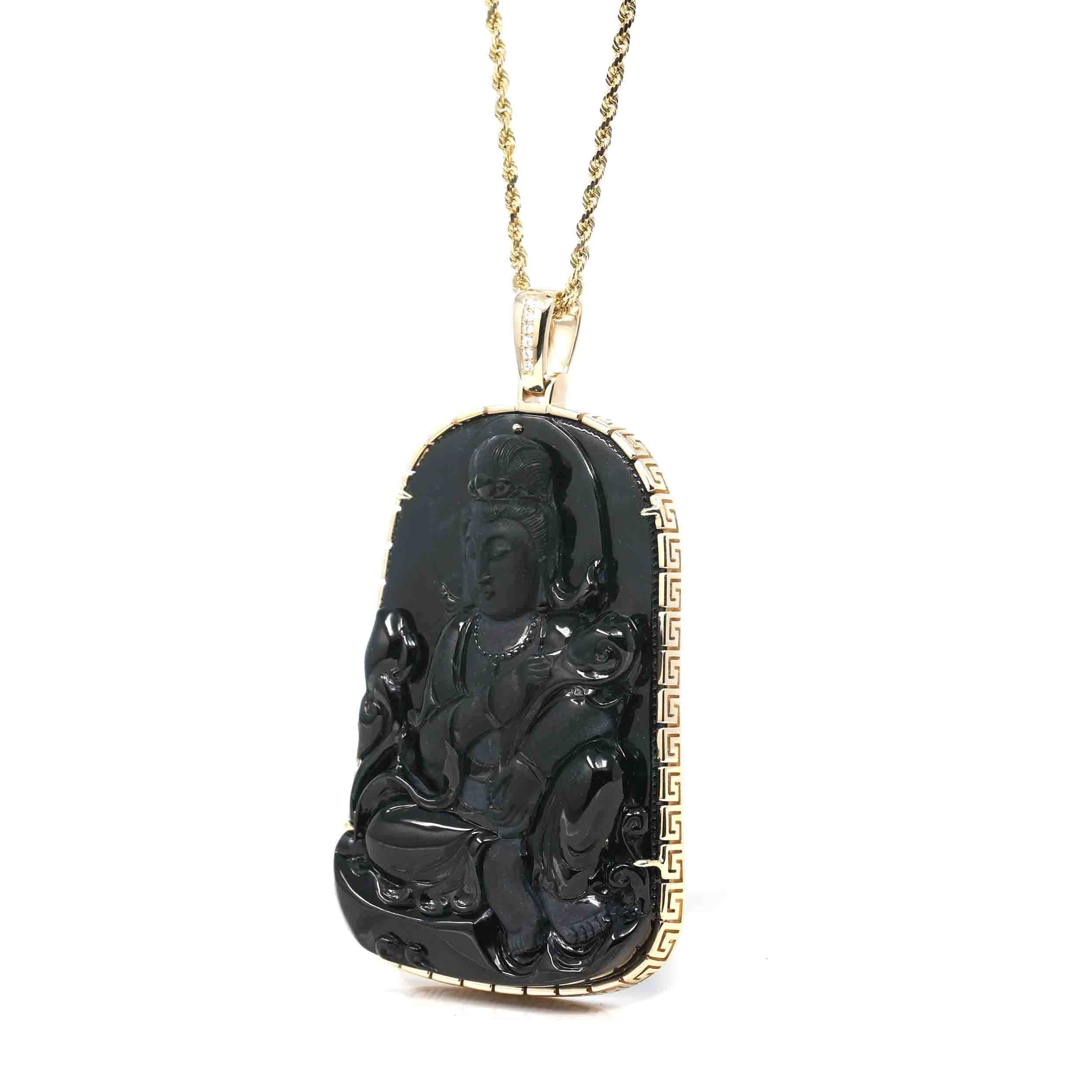 Baikalla 14k Yellow Gold "Goddess of Compassion" Genuine Black Burmese Jadeite Jade Guanyin Necklace With Gold Bail