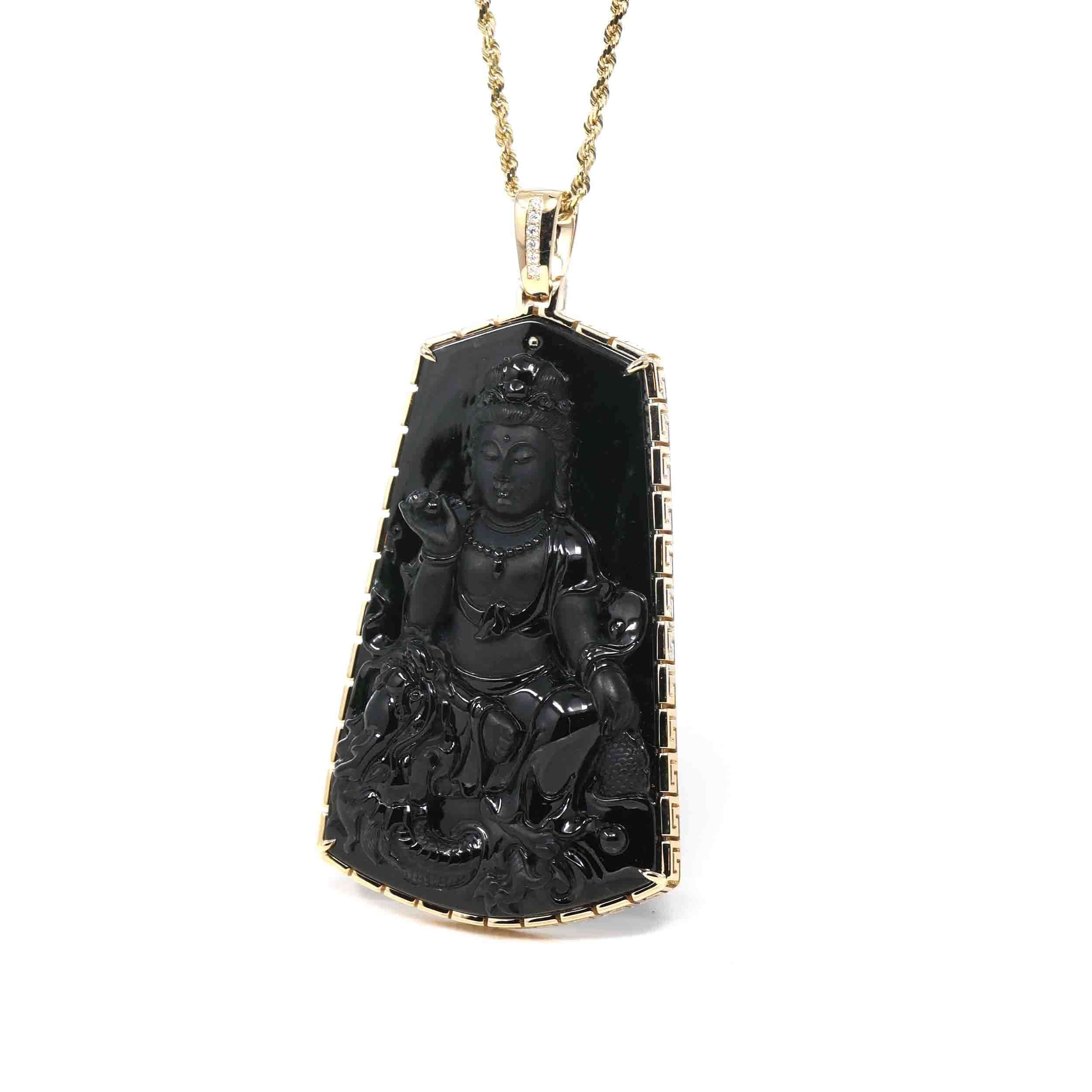 *Design concept--- Made with very high-quality genuine Burmese black jadeite jade. The excellent craftsmanship portrays the "goddess of compassion", the Guan Yin. The handcraft is stunning. This particular necklace has amazing translucency, with a very special icy black color matrix. Great Gift for men, and collectible itme.