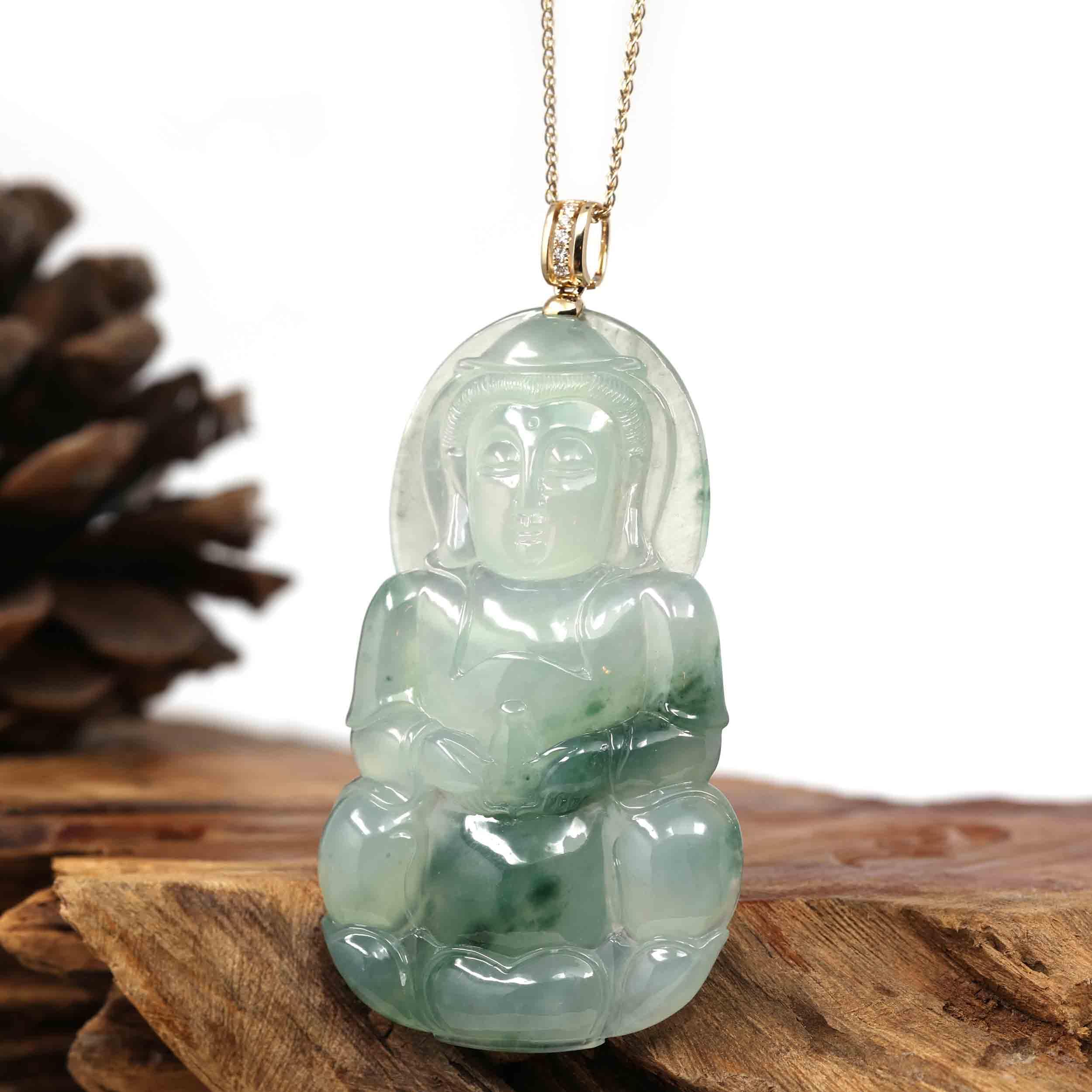 *Design concept--- Made with genuine Burmese ice-blue jadeite jade. The excellent craftsmanship portrays the "goddess of compassion", the Guan Yin. The handcraft is stunning. This particular necklace has amazing translucency, with a very special icy color matrix. Great size for both men and women.