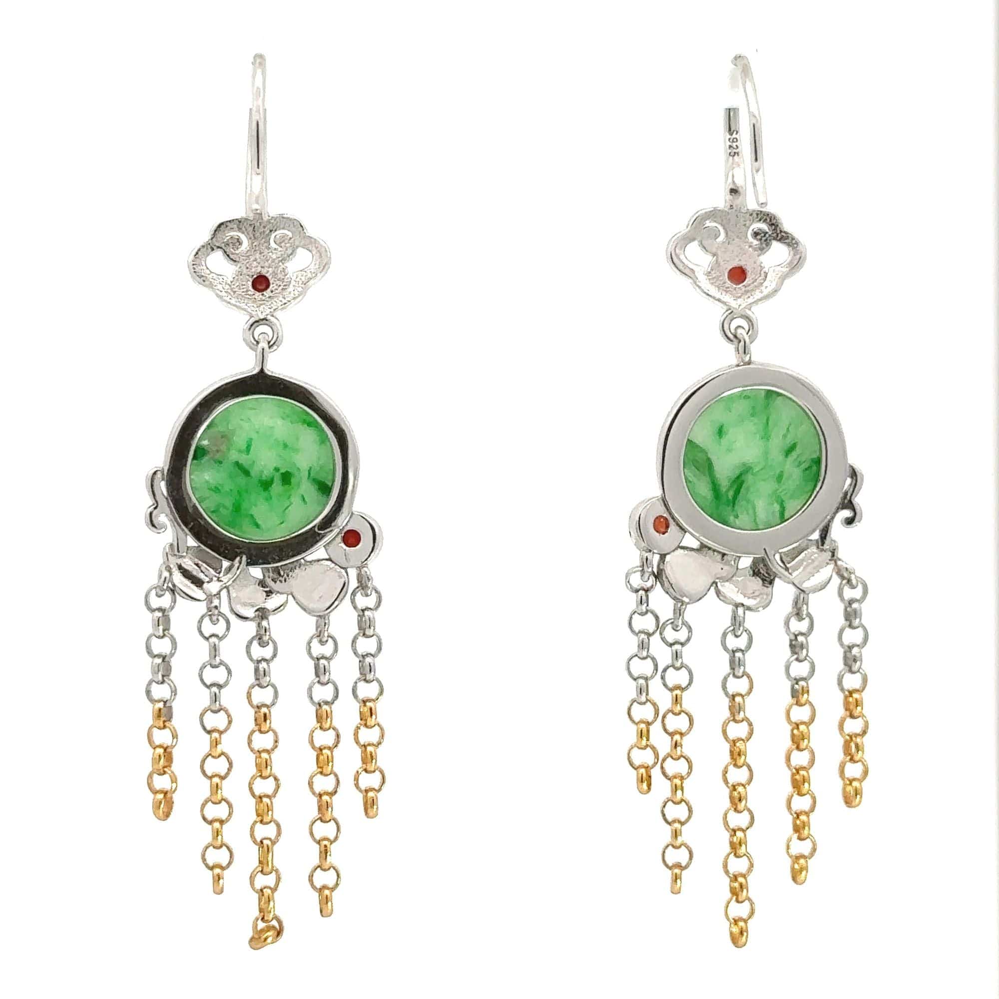 Crafted in a vintage-inspired design, this earrings pays homage to the classics while adding a modern touch. The natural jadeite jade centerpiece, with its captivating hues, is embraced by intricate sterling silver detailing, accented by delicate gold plating. These earrings are not just an accessory; they are a piece of history, a symbol of good luck, fortune and peace. Elevate your style with this unique treasure, perfect for both special occasions and everyday elegance.