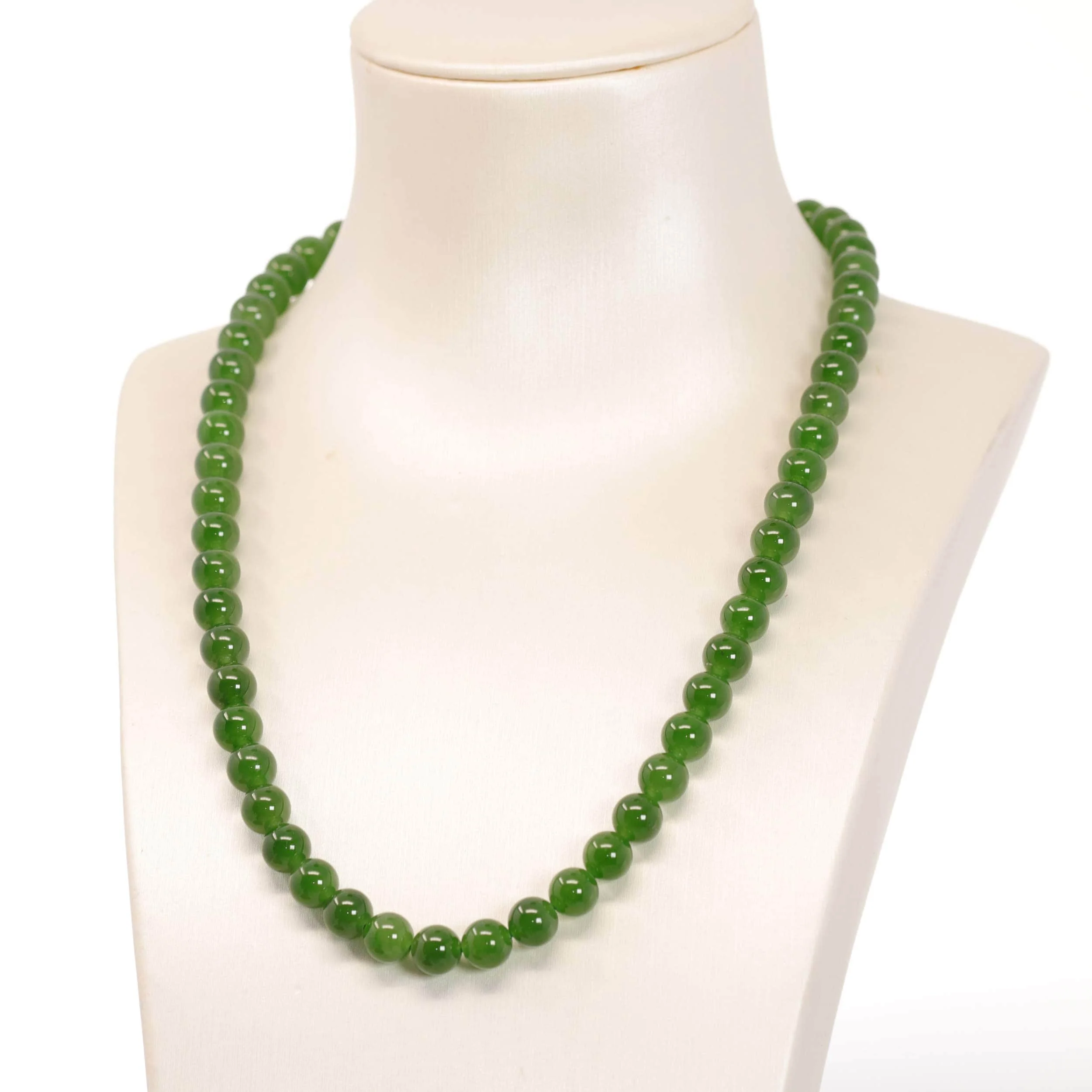* DETAILS---Genuine Green Jade Necklace. This necklace is made with very high-quality genuine apple green nephrite jade without any black flaws. The beads' texture is so smooth and translucent. In fact, the black spots are just patches that are so dark green it appears black. That's why green jade always comes with spots of black. So if the piece is green without black spots, just like a VS diamond vs. a SI diamond, the one free of conclusions will be more expensive. The classic round beads necklace looks very beautiful and affordable. It's a high-quality and perfect gift for yourself or your love.