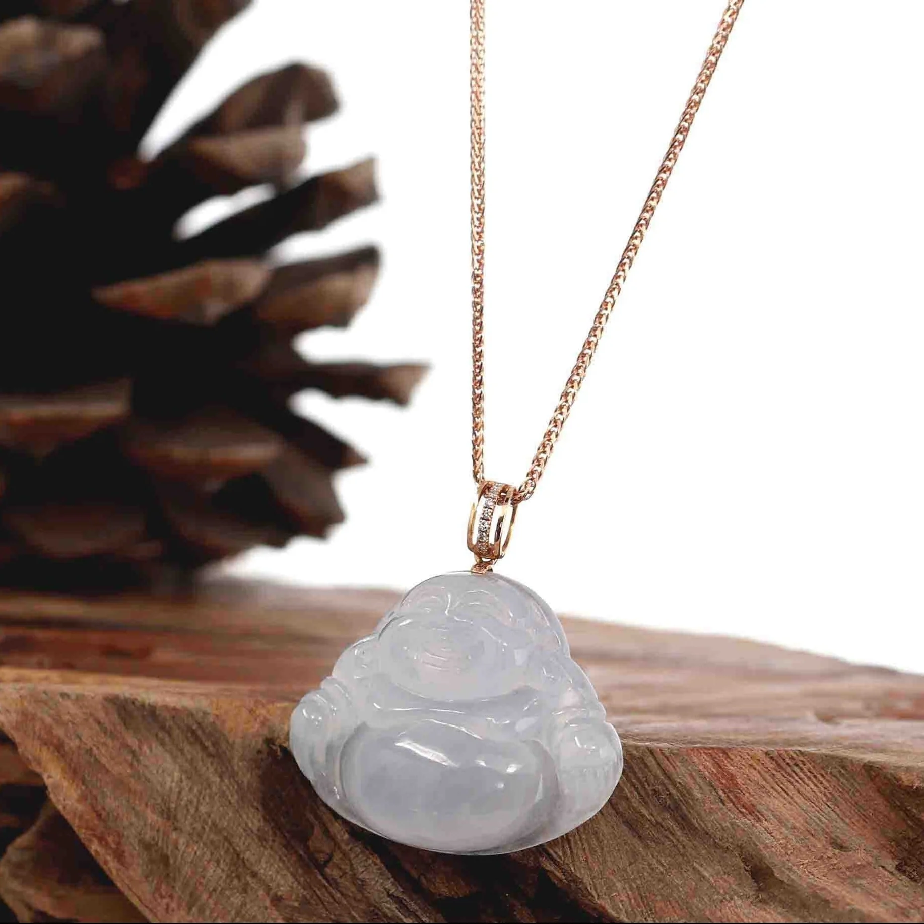 * INTRODUCTION---18k Rose Gold & Genuine Light Lavender Ice Jadeite Jade Buddha Pendant Necklace. The person who wears a Happy Buddha pendant around the neck attracts positive energy. They emit positive waves into the environment around them. The belief is all of the entire negativity is destroyed and a fighting spirit is generated within the person. The term Buddha literally means enlightened one, a knower to be a mentor to save and protect you. Representing prosperity, good luck, and wealth. Perfect everyday style.