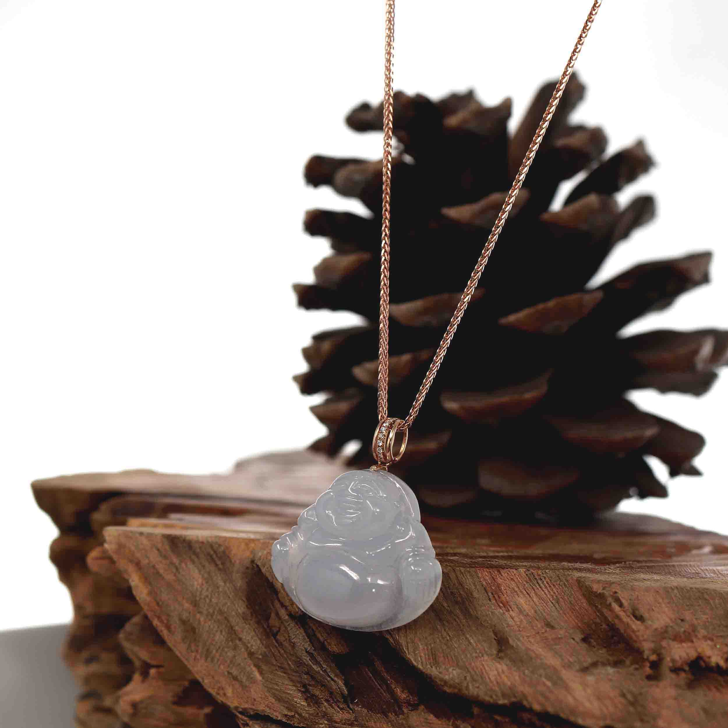 * INTRODUCTION---18k Rose Gold & Genuine Light Lavender Ice Jadeite Jade Buddha Pendant Necklace. The person who wears a Happy Buddha pendant around the neck attracts positive energy. They emit positive waves into the environment around them. The belief is all of the entire negativity is destroyed and a fighting spirit is generated within the person. The term Buddha literally means enlightened one, a knower to be a mentor to save and protect you. Representing prosperity, good luck, and wealth. Perfect everyday style.