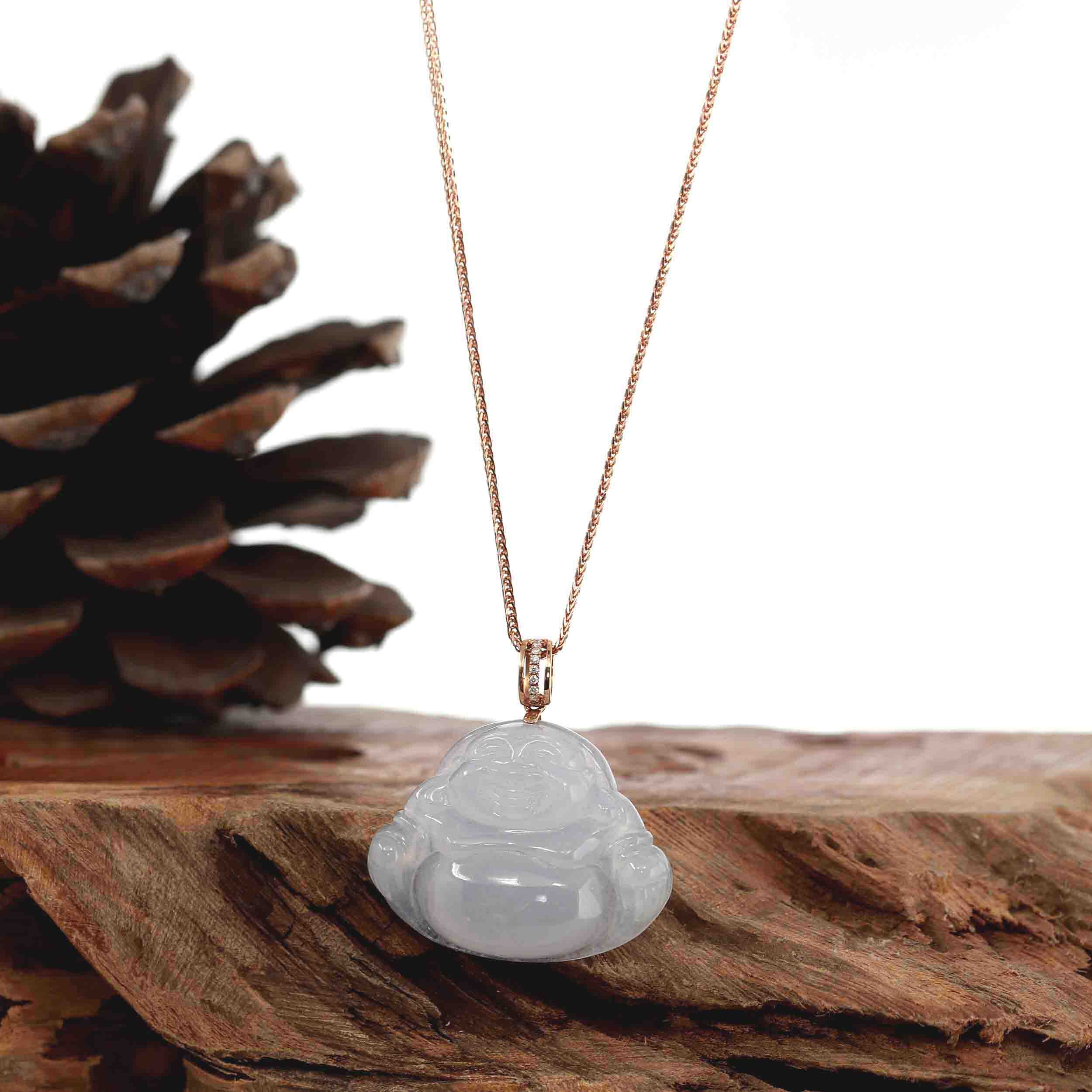 * INTRODUCTION---18k Rose Gold & Genuine Light Lavender Ice Jadeite Jade Buddha Pendant Necklace. The person who wears a Happy Buddha pendant around the neck attracts positive energy. They emit positive waves into the environment around them. The belief is all of the entire negativity is destroyed and a fighting spirit is generated within the person. The term Buddha literally means enlightened one, a knower to be a mentor to save and protect you. Representing prosperity, good luck, and wealth. Perfect everyday style.