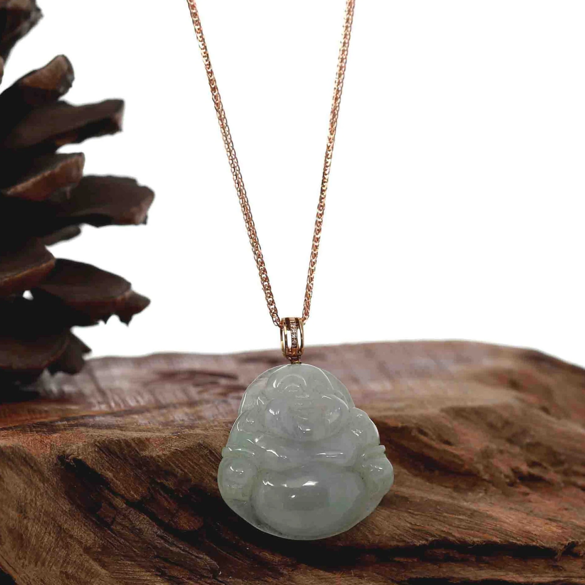 * INTRODUCTION---18k Rose Gold & Genuine Light Lavender Ice Jadeite Jade Buddha Pendant Necklace. The person who wears a Happy Buddha pendant around the neck attracts positive energy. They emit positive waves into the environment around them. The belief is all of the entire negativity is destroyed and a fighting spirit is generated within the person. The term Buddha literally means enlightened one, a knower to be a mentor to save and protect you. Representing prosperity, good luck, and wealth. Perfect everyday style.