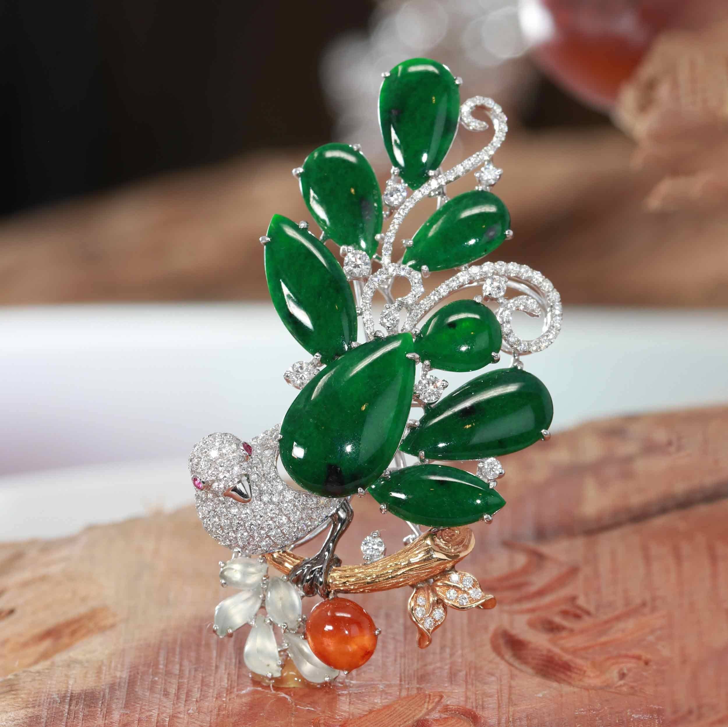 The intricate detail on the neckpiece is combined with rare red jadeite, and vastly desired ice jadeite carved elegantly into shapes of leaves.