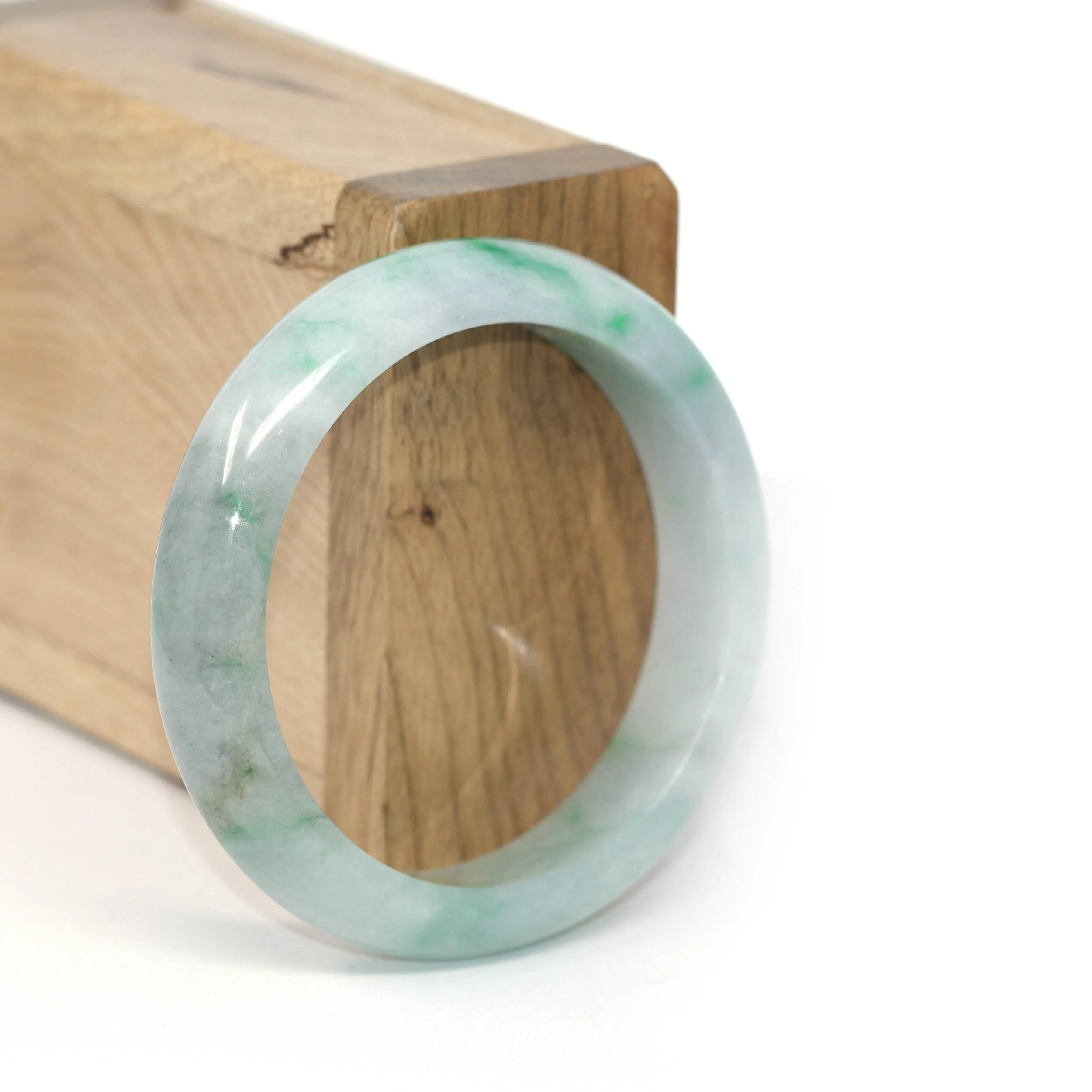 * DETAILS--- Genuine Burmese Jadeite Jade Bangle Bracelet. This bangle is made with fine genuine Burmese Jadeite jade. The jade texture is fine and smooth with green color. It just has little clouds and a natural stone line. The Classic half-round comfort style bracelet. Jadeite jade is the toughest gemstone on the planet. People believe the real jade is a lucky gemstone. It's a special gift for you and your love.