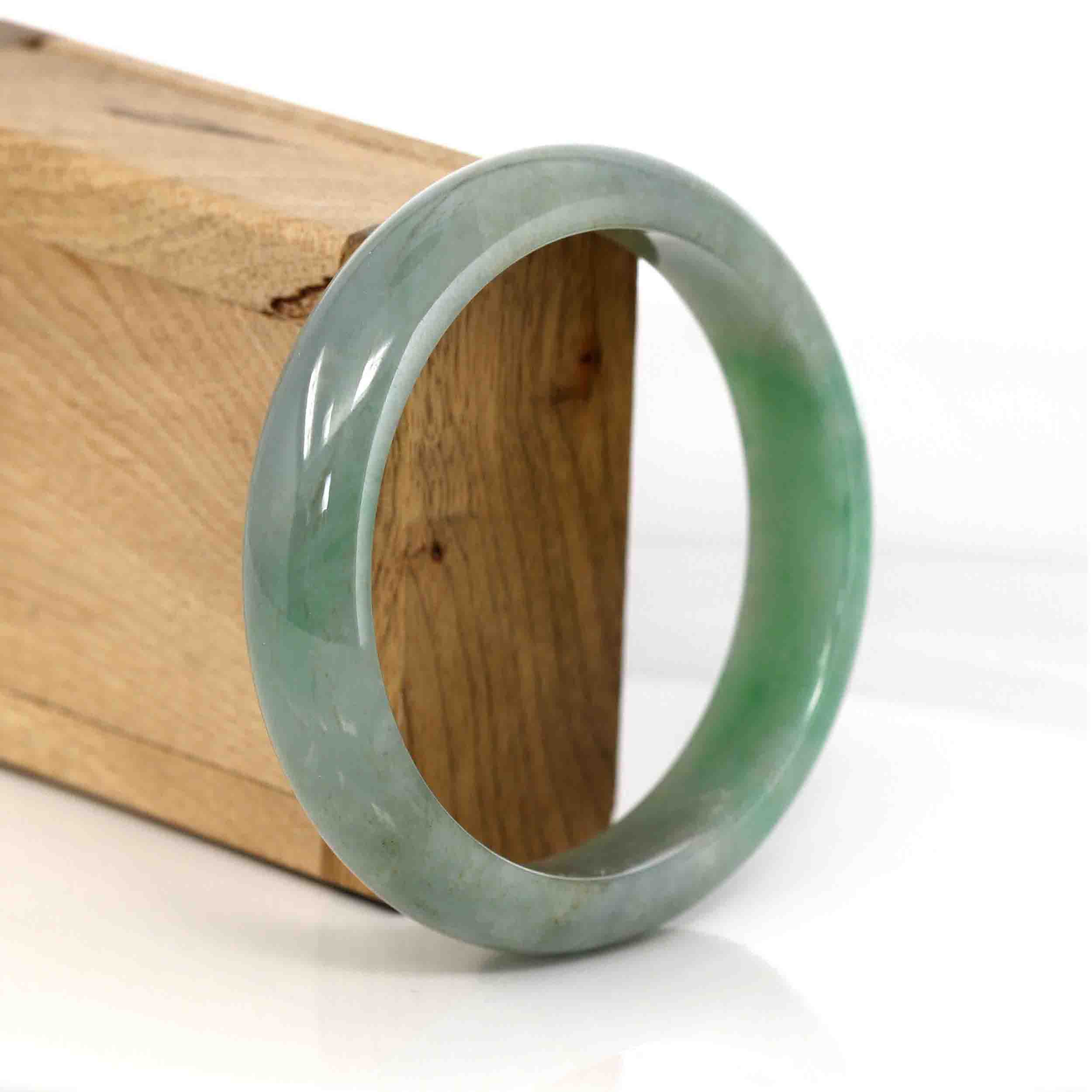 * DETAILS--- Genuine Burmese Jadeite Jade Bangle Bracelet. This bangle is made with genuine Burmese Jadeite jade, The jade texture is ok with some green color inside. The green color looks gorgeous. Just has some natural clouds and black spots. It's a very unique bangle. You know the genuine jade bangle is always meaningful for someone. The Classic half-round style bracelet. It's a special gift for yourself or your love.