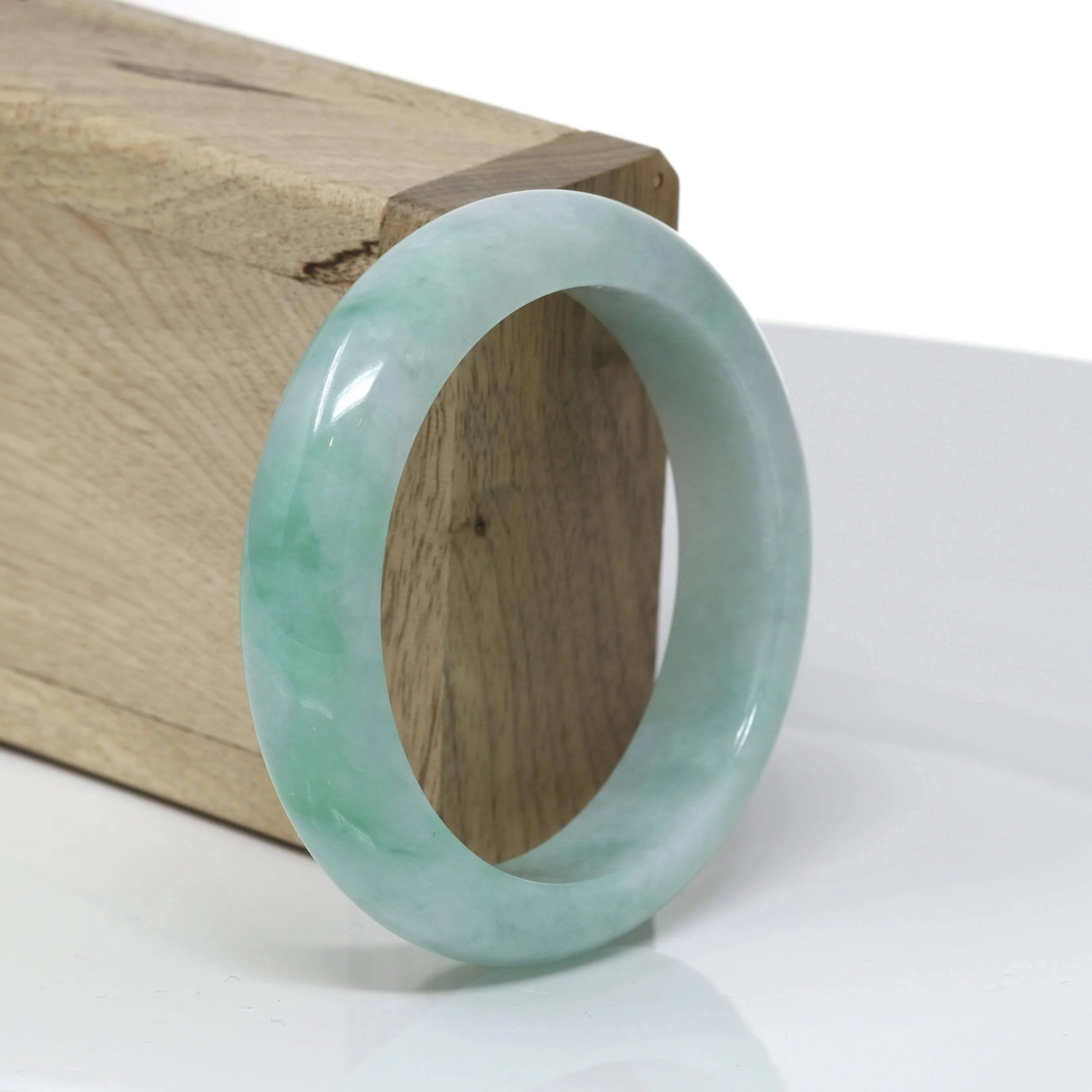 * DETAILS--- This natural high-quality Burmese Jadeite bangle is a lovely beautiful apple green all throughout, as seen in the pictures. The texture and color is very even throughout the bangle, and this bangle is very translucent under the light. This bangle is characterized by beautiful, even, apple green all throughout the bangle. Characterized by lovely apple green patterns all over the bangle, and very minor stone lines. The size is 56.43mm which is perfect for medium wrists. The width is not too wide, the bangle has a beautiful, rich, elegant look to it. This bangle is truly special because of its gorgeous color. Very good for daily wear. Jadeite jade is a tough stone, the hardness is 6.5-7 on the Mohs hardness scale, just a little bit under sapphire/rubies (corundum). Making jade a perfect stone for a daily wear bangle.