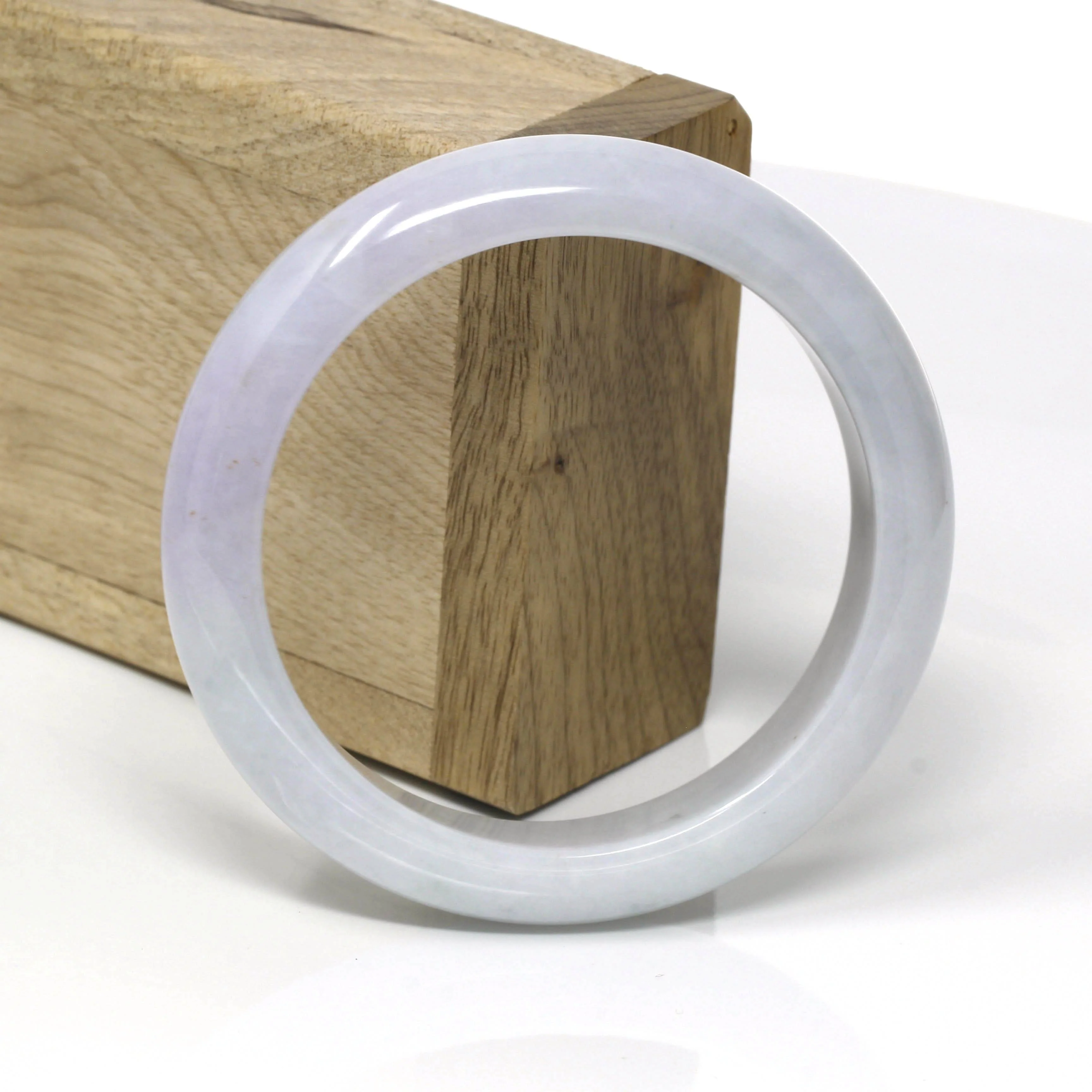 * DETAILS--- This bangle is crafted from genuine Burmese jadeite jade. It features a semi-smooth, translucent texture with a soft light lavender color throughout. The jade shows minimal natural lines with some light cloudy spots, including some red spots on the inside of the bangle, highlighting its natural character and beauty. This piece is carved in a half-round, comfort-fit style, meaning the inside of the bangle is flat for a comfortable feel on the wrist, making it ideal for everyday wear. Known for its durability, jadeite is also believed to bring good luck and positive energy. This bangle makes a thoughtful and meaningful gift, whether for yourself or someone special.