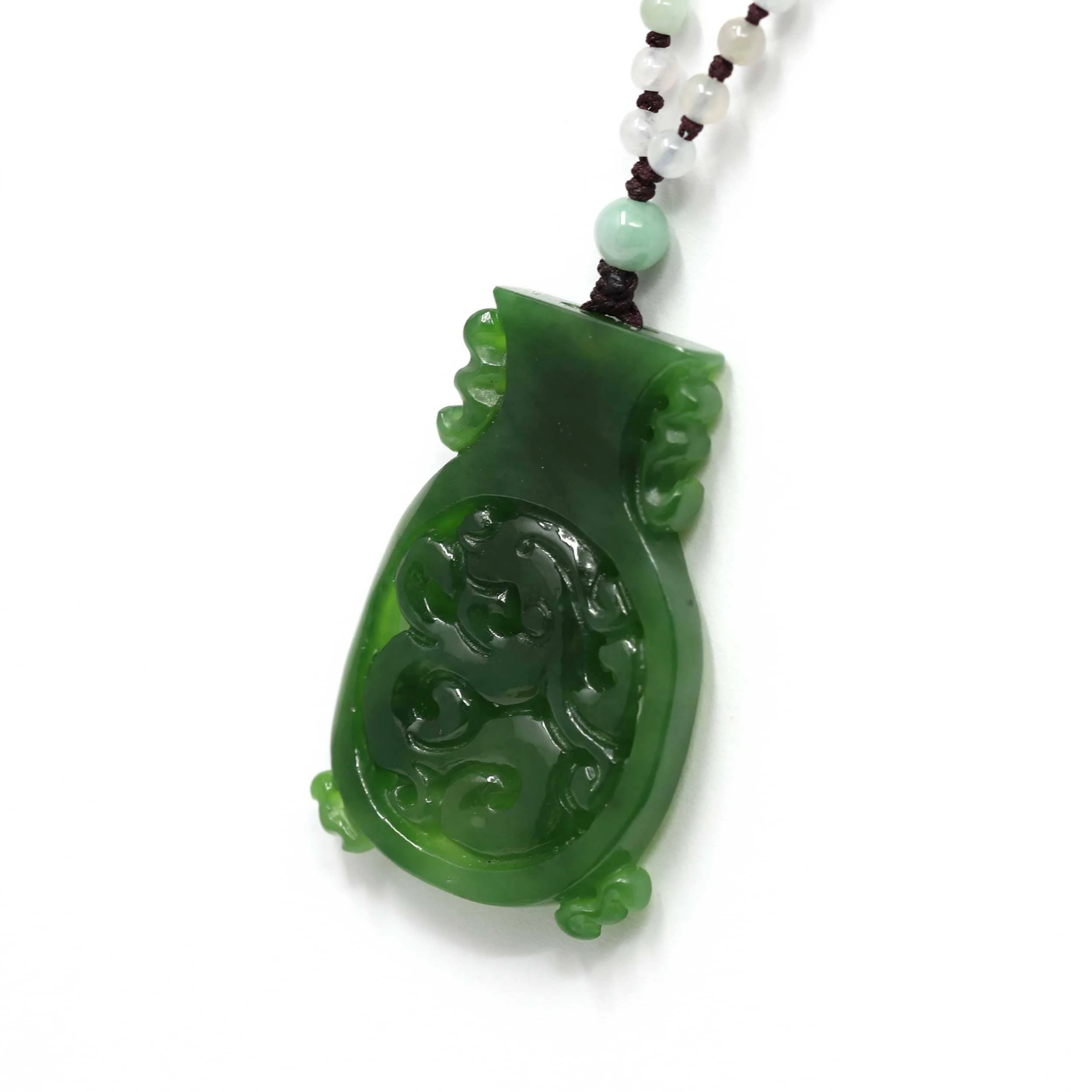 Genuine HeTian Nephrite Green Jade Good Luck Vase Pendant Necklace With Dragon