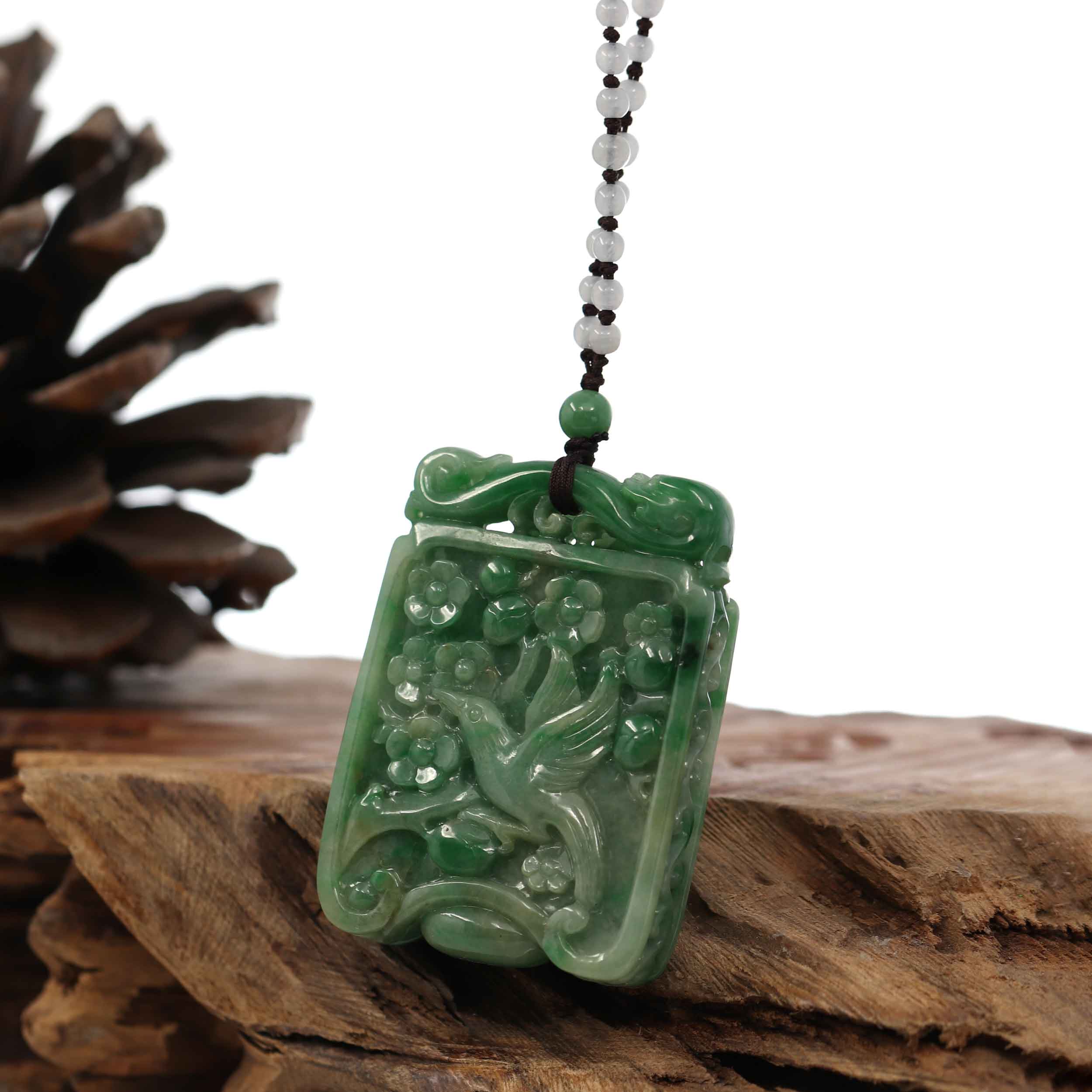 Genuine Green Jadeite Jade "Lucky Bird on Branch" Pendant Necklace With Real Jadeite jade Beads Necklace