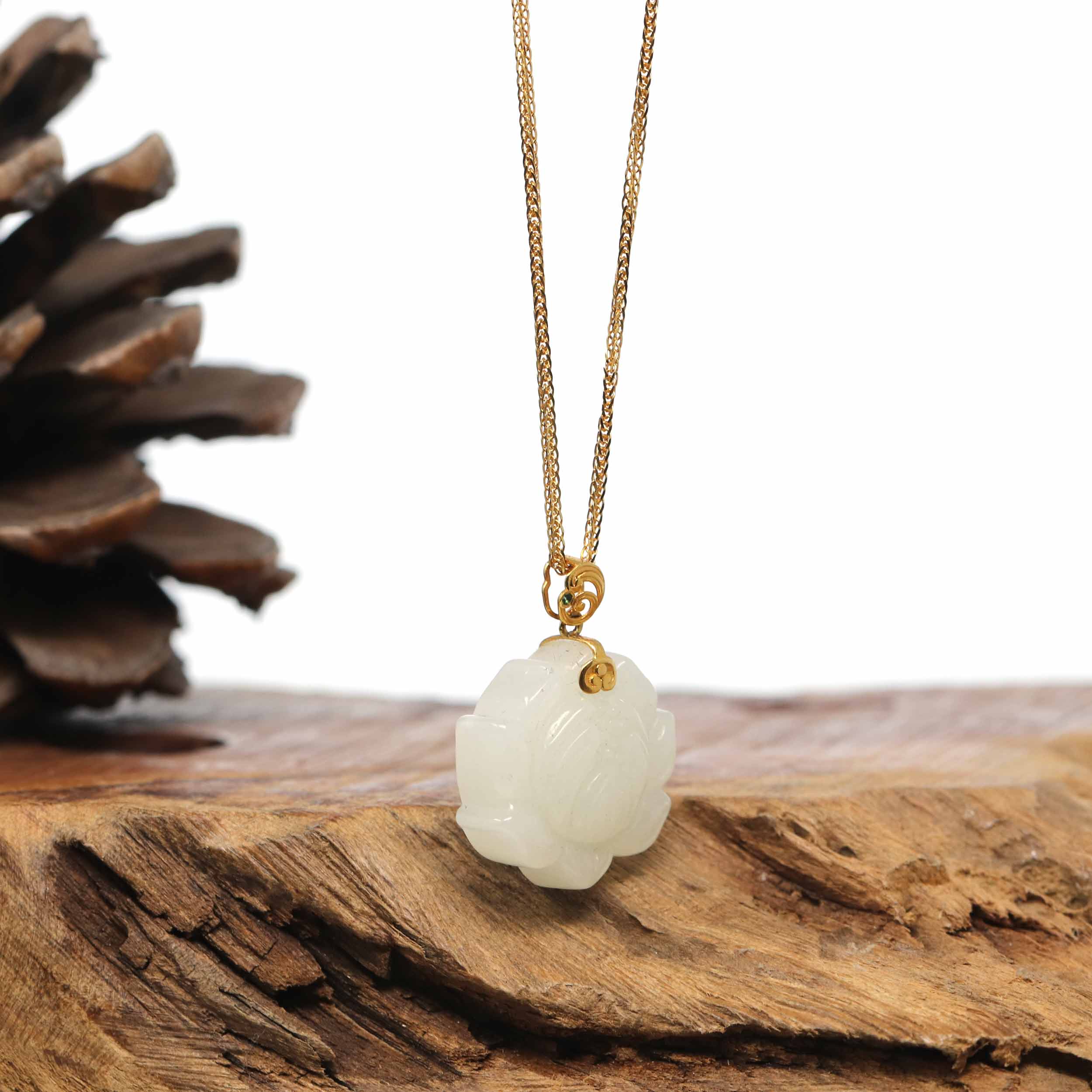 Genuine White Nephrite Jade Lotus Pendant Necklace With 18k Gold Bail